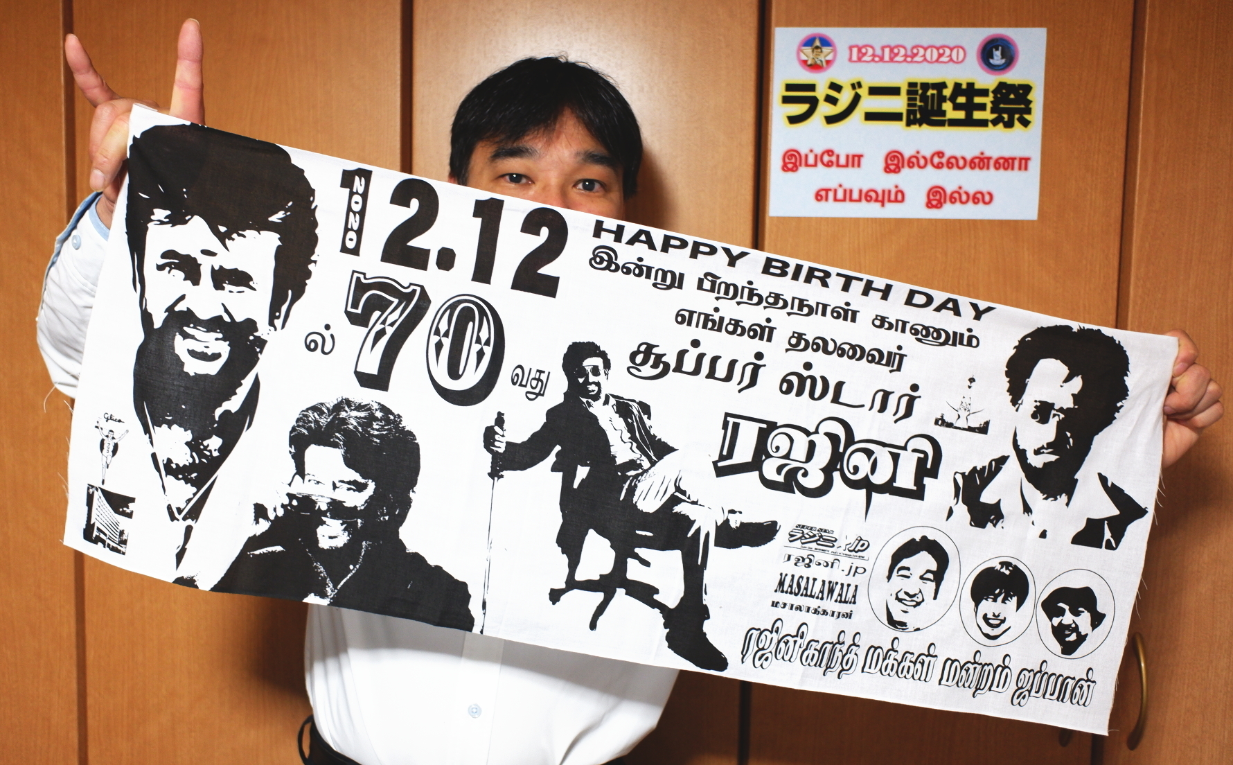 是非この手ぬぐいを使って写真撮影をして頂き、ラジニ様誕生日当日12月12日に
